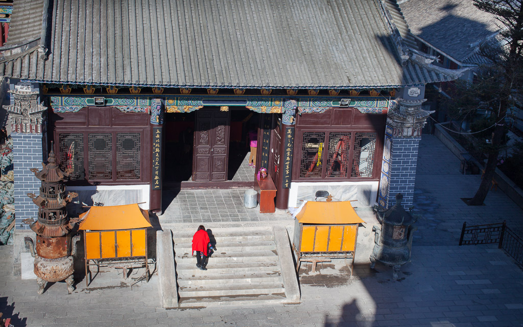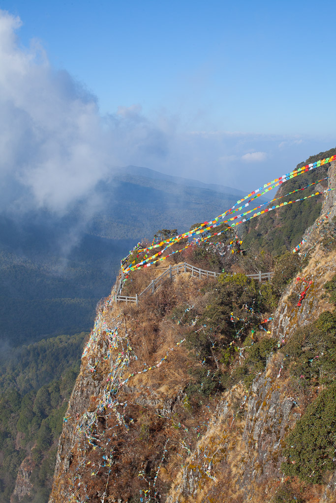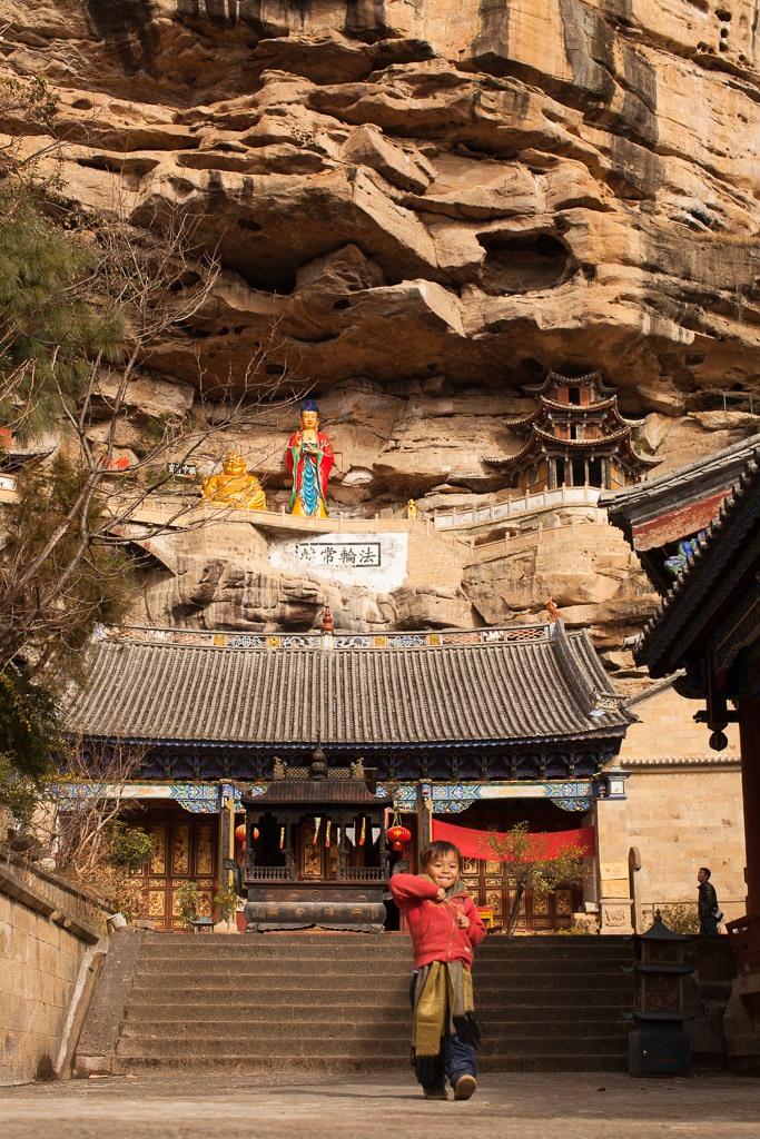 Guanyin and Maitreya, the smiling Buddha, are visible from the main gate. They on a passage which links two overhanging temples part way up an overhanging cliff over the main temples below.