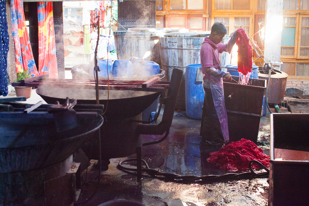 Stiching cloth: Tye-dyeing in China predates hippies 1000 years. While the Miao minorities in GuiZhou use wax to form patterns; the Bai minority workers at ZhouCheng use stitching to knot the cloth into beautiful patterns before soaking the cloth in wooden vats of natural indigo dye. The women we met doing this work were well into their seventies, had great eye sight, and have been stitching cloth for dying for over 50 years.