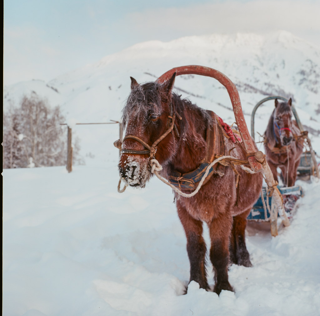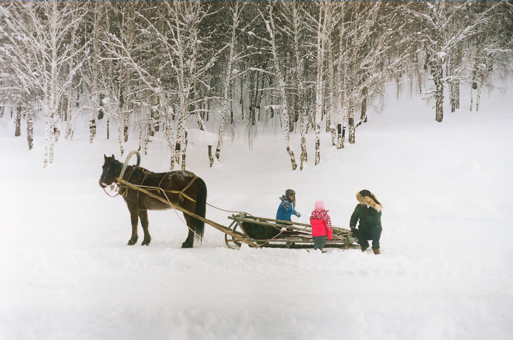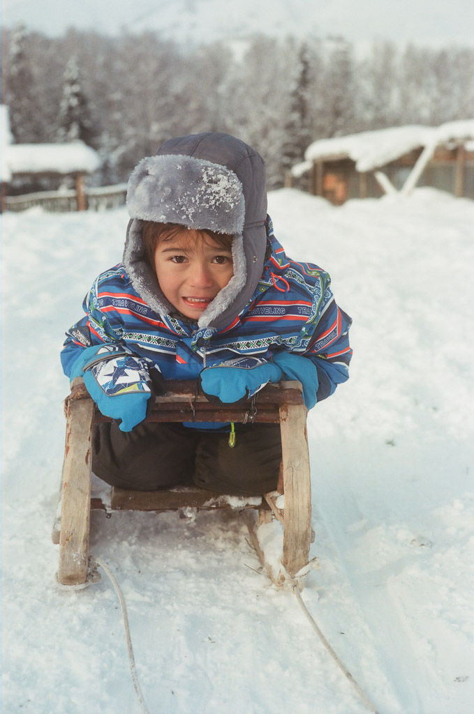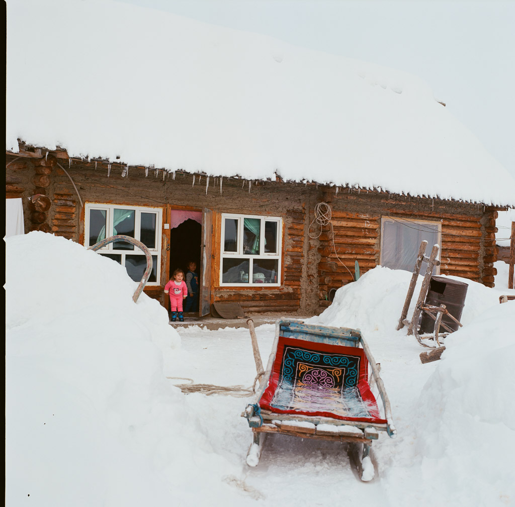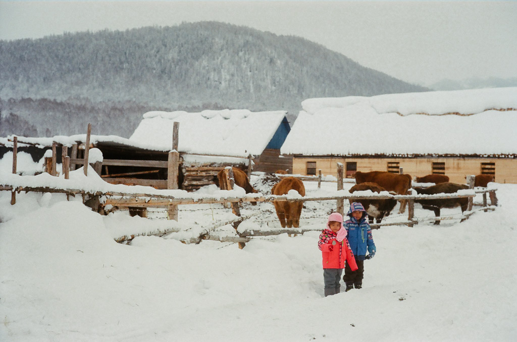 Kids on their way to school. Skis are made of pine wood with horse skins on the bottom enabling them to slide down hill and grip up hill. The earliest evidence of skiing on earth are 10,000 year old wall paintings of skiing from here in the ALeTai mountains. (M2 Portra 800)