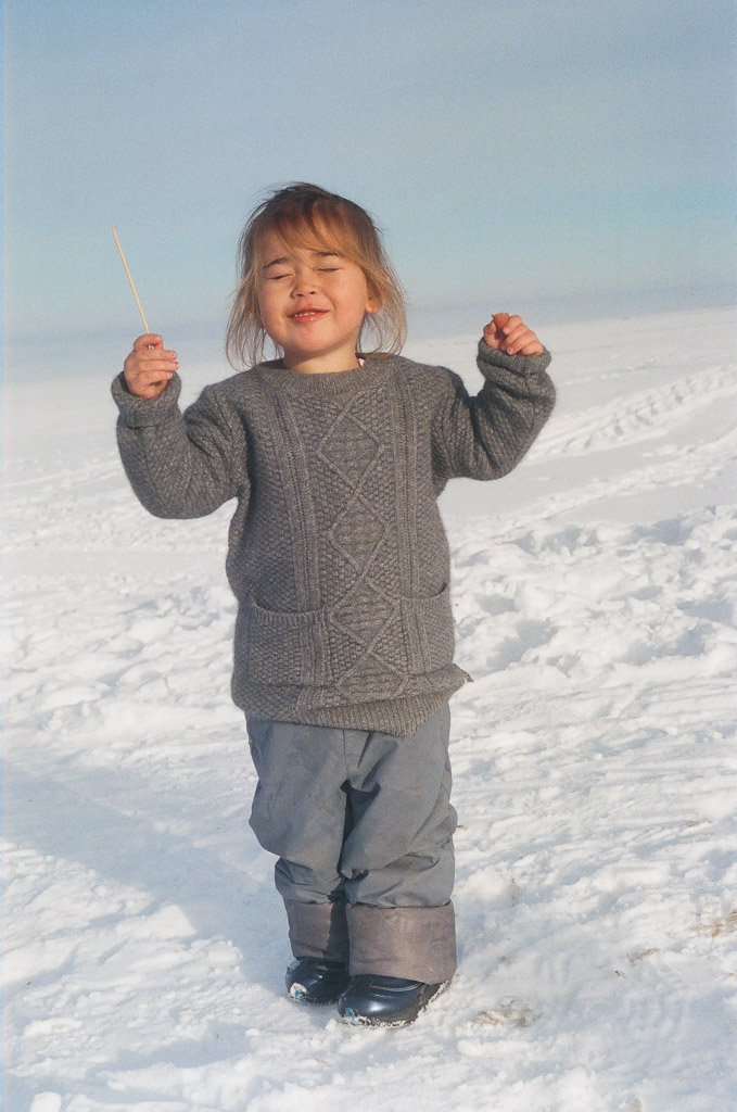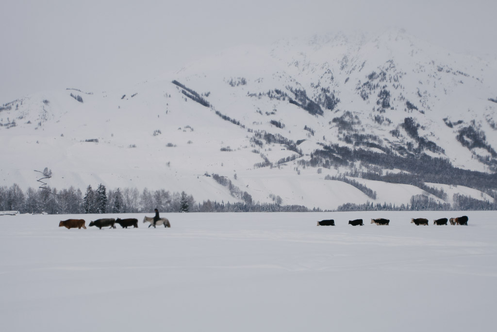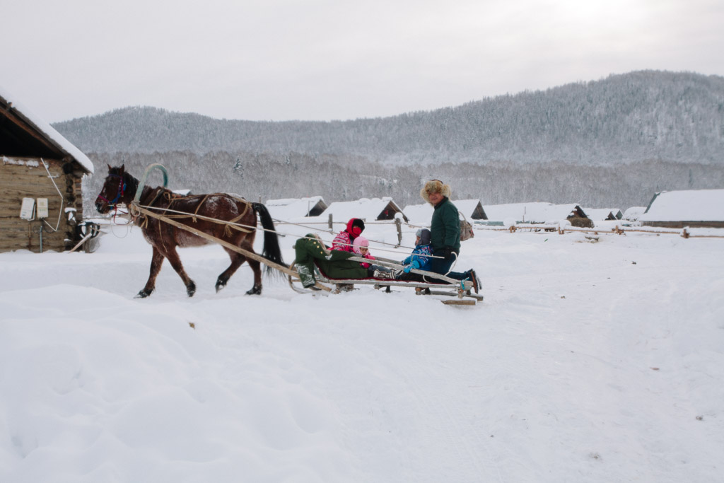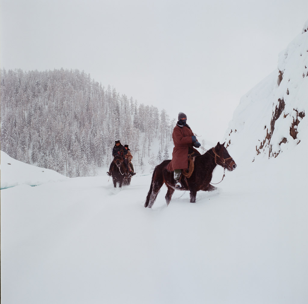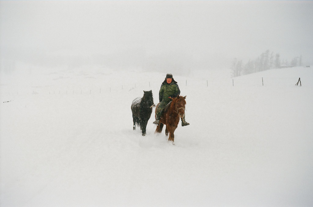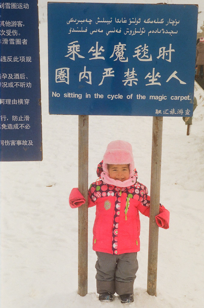 Kids on their way to school. Skis are made of pine wood with horse skins on the bottom enabling them to slide down hill and grip up hill. The earliest evidence of skiing on earth are 10,000 year old wall paintings of skiing from here in the ALeTai mountains. (M2 Portra 800)
