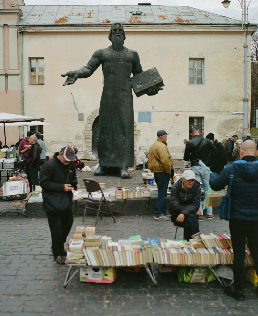 bl Family pages20232023_ukraine3Ukraine, Lviv Ukraine, Lviv - Ivan Fedorov, father of printing 500 years ago standing in a used book market today (Kodak Portra 400, GF670)