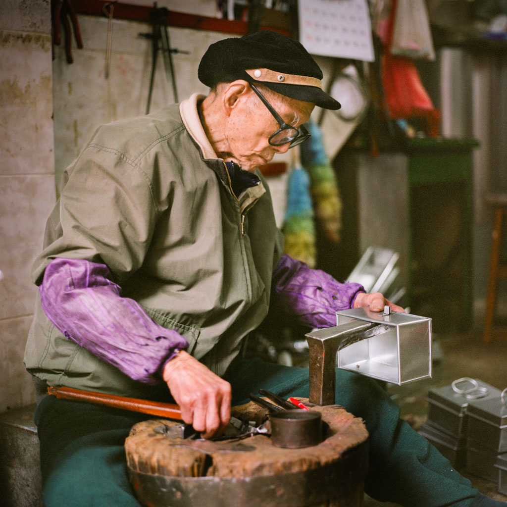 - Mak Sing Yin is 99 years old and has been hand-making tin items such as boxes, mail boxes, buckets, pots and pans from roles of sheet metal for over 80 years. The stump in front of him is well over 100 years old and the metal band around it was made by 'his master' who taught this trade when he was a kid. Mak works 7 days per week and I took this photo on Sunday, 25 Jan 2015. ( 6x6 Fujicolor Pro 400H in poor light )