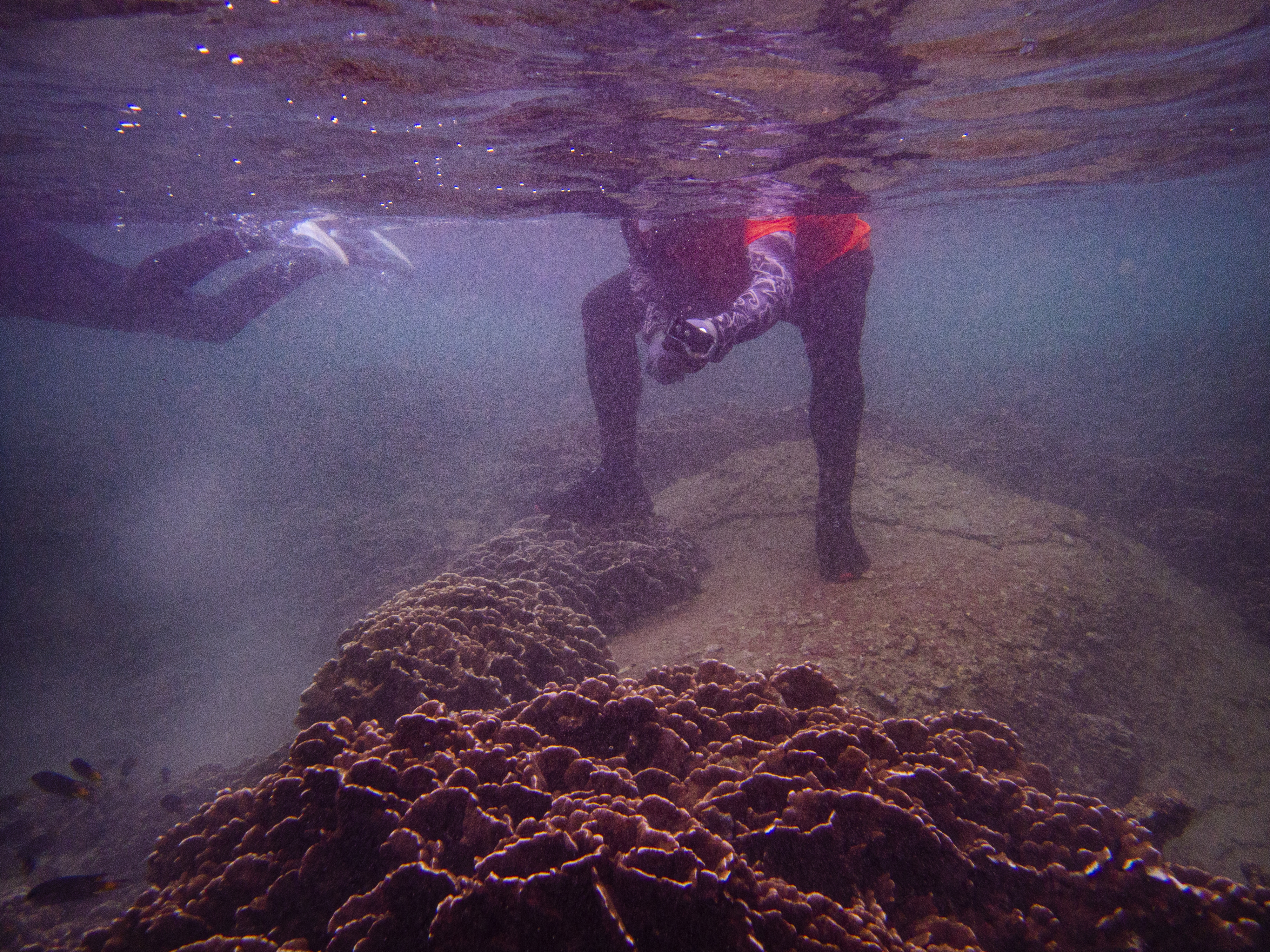 2021 September - West Sharp Island; Hong Kong Kiu Tsui Country Park visitors with tour operators walk on coral in the coral protection area, take photos of fish with selfie sticks and kill sea urchins with metal rods to attract fish.