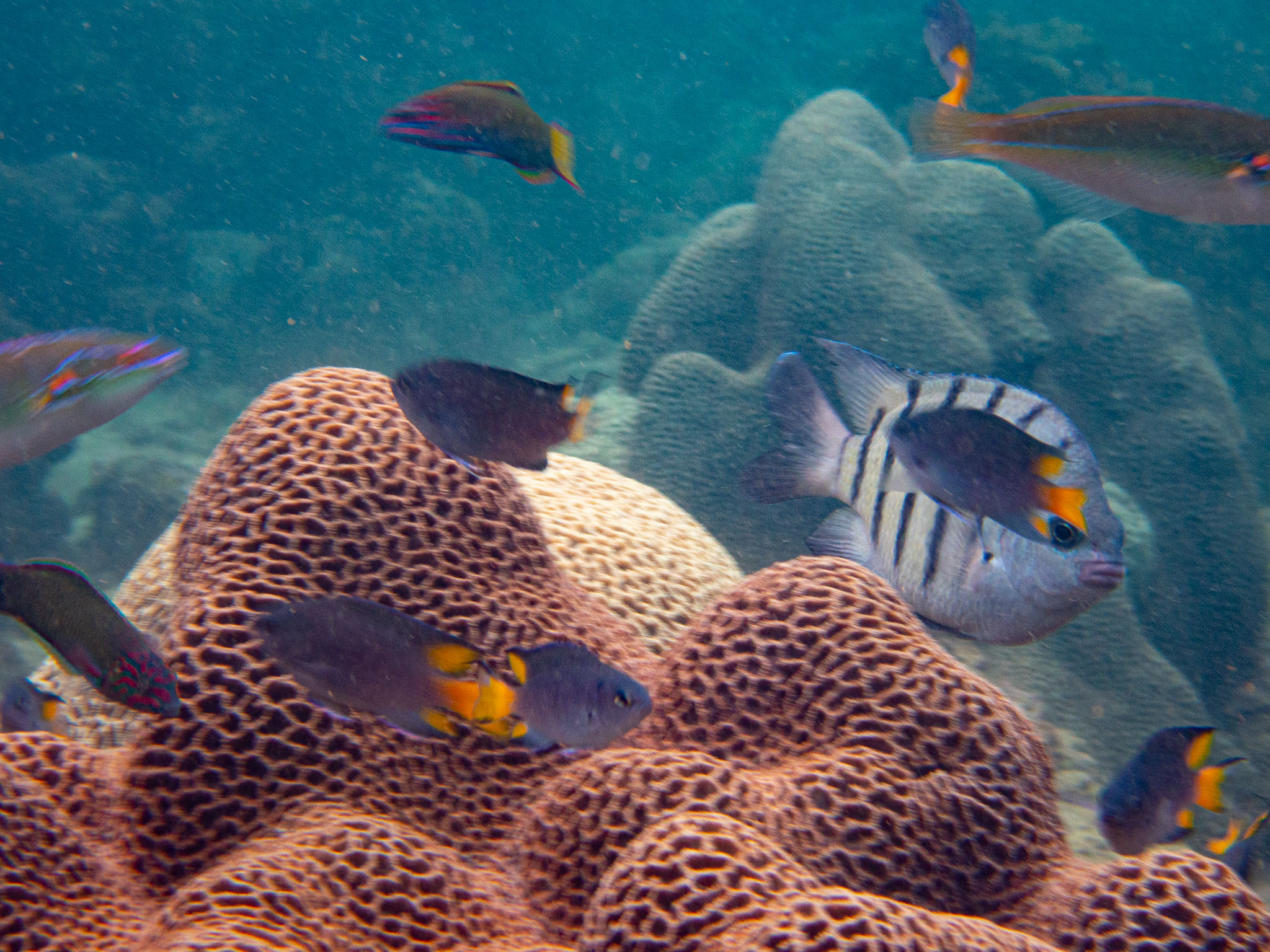 2021 May - Shelter Island; Cutribbon wrasse, Moon wrasse, Chinese Demoiselle, Pearl-spot chromis and Bangal Sargeant